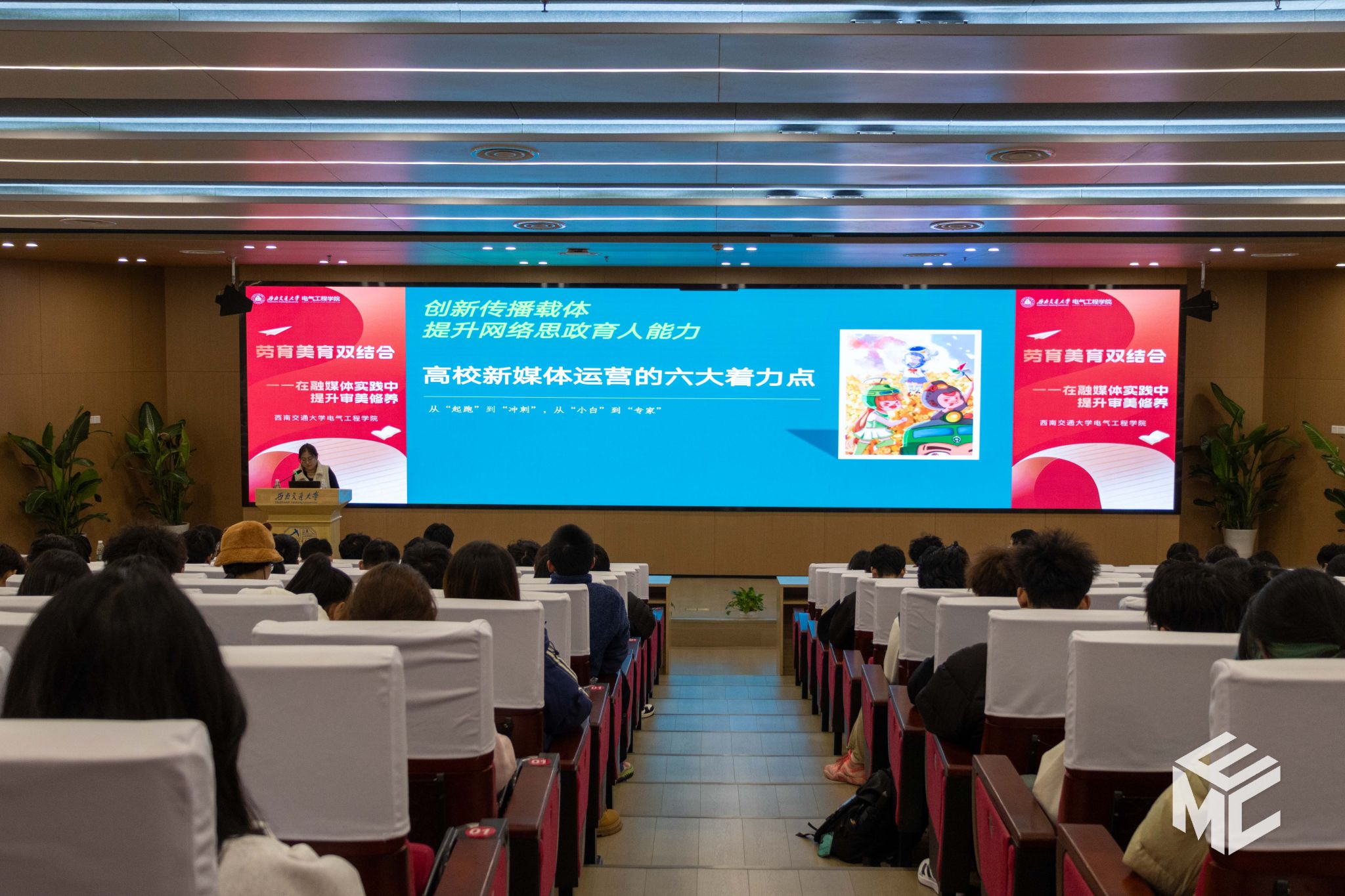 To explore the in-depth integration of "labor education" and "aesthetic education" in media convergence practices, and to enhance the new media operation skills and aesthetic cultivation of student leaders, the first session of the 2025 "Dual Integration of Labor and Aesthetic Education—Enhancing Aesthetic Cultivation in Media Convergence Practices" was successfully held in the No. 1 Lecture Hall of the Xipu Campus Library on the evening of November 20. The event was hosted by the School of Electrical Engineering and organized by the School of Electrical Engineering Media Affairs Center (EMC). Guest speakers included Ms. Zhu Ying-yan, Director of the New Media Center of the Party Committee's Publicity Department at Southwest Jiaotong University, and Mr. Ju Hong-wei, Photographer from the Party Committee's Publicity Department (News Center) of Southwest Jiaotong University. The event was chaired by Ms. Zhao Na, a counselor from the School of Electrical Engineering.