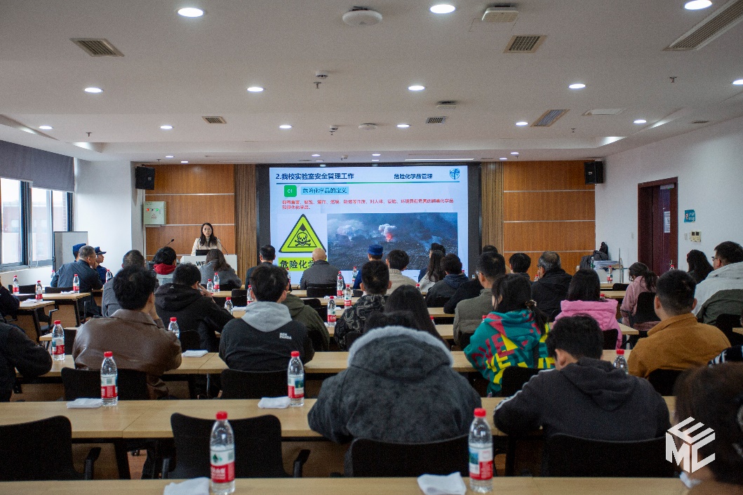 随后,赵春花老师系统介绍了国家及学校关于实验室安全管理的规章制度与具体要求,并聚焦于日常易发的安全隐患,通过列举“插线板违规串接”“易燃物品随意堆放”“实验物品摆放杂乱”等案例,警示师生时刻保持警惕。她鼓励大家积极投身校园安全文化建设,主动增强自我保护能力,以实际行动践行从“要我安全”到“我要安全”,再到“我会安全”的理念转变。