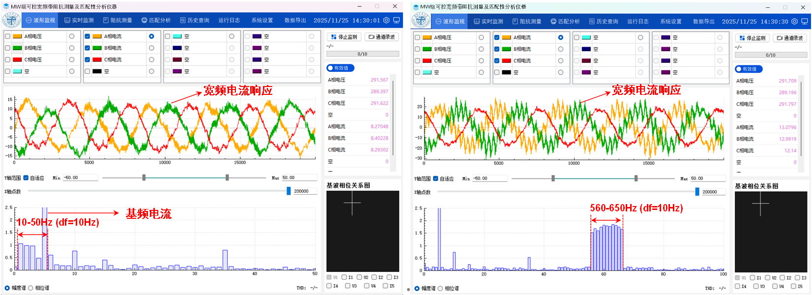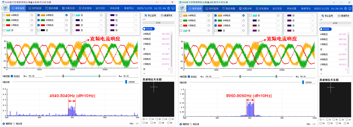该仪器攻克了高保真宽频谐波发射、并网变流器频率耦合干扰等难题,相比传统单频式阻抗测量方法测量速度大幅提高。本次测量仅用时5分钟就得到了光伏发电系统10Hz至10kHz的阻抗特性,验证了该测量技术的先进性。